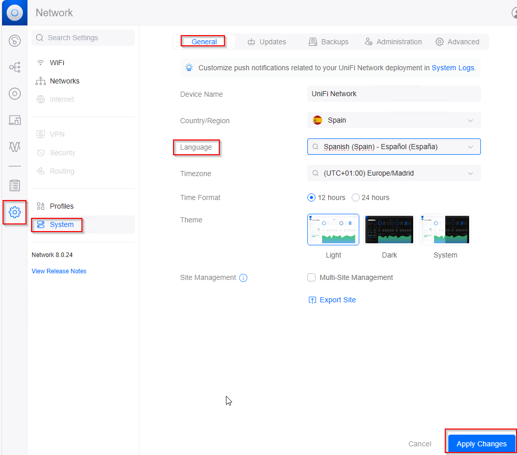 Para cambiar el idioma de UniFi Network Application, vamos a Settings > System > General > Language. Aunque yo siempre recomiendo dejar el idioma en ingles para a la hora de buscar problemas, sea más fácil buscar en Google.