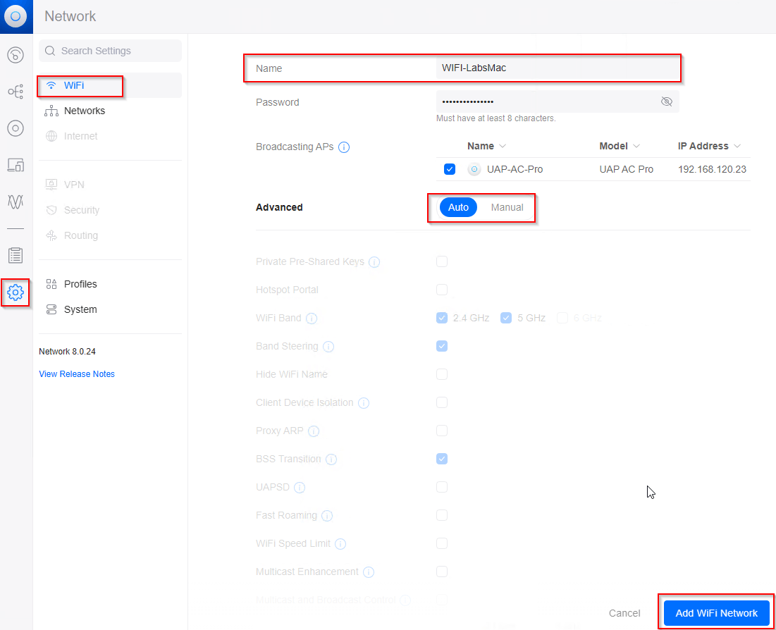Asignamos un nombre, contraseña, lo de avanzado puede ser manual o auto, para finalizar, clicamos en Add Wifi Network.