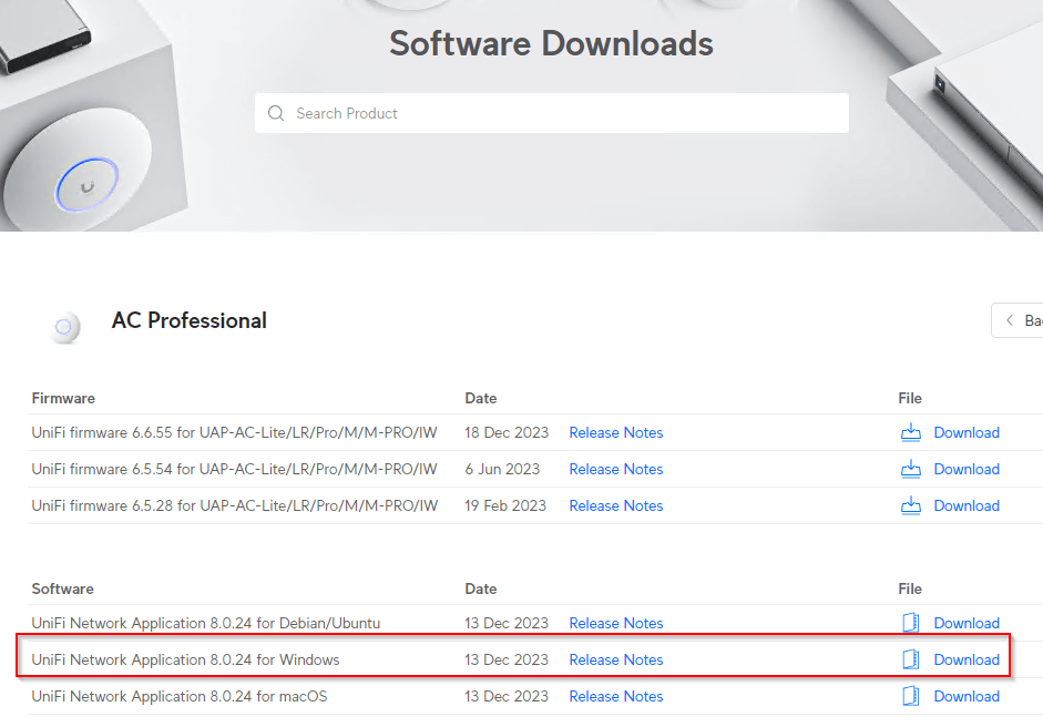 Vamos a la página de descargar: Software Downloads – Ubiquiti. Buscamos el módelo de nuestro dispositivo de red, en mi caso, UAP-AC PRO