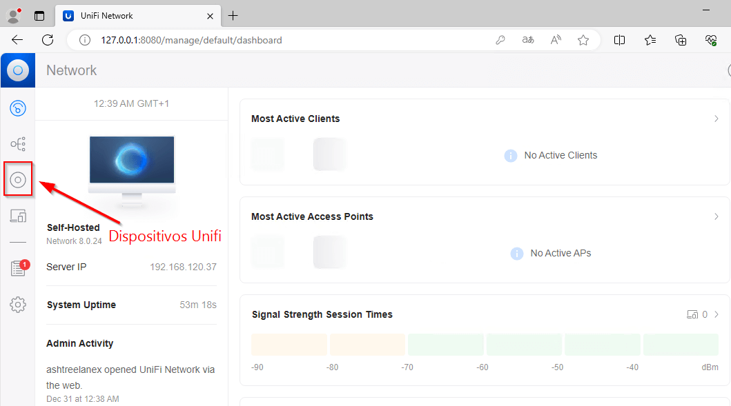 Una vez iniciados sesión ya podremos ver la interfaz del software de gestión. Clicamos en Dispositivos Unifi (Unifi Devices), para adoptar (adopt) el punto de acceso, UAP-AC PRO.