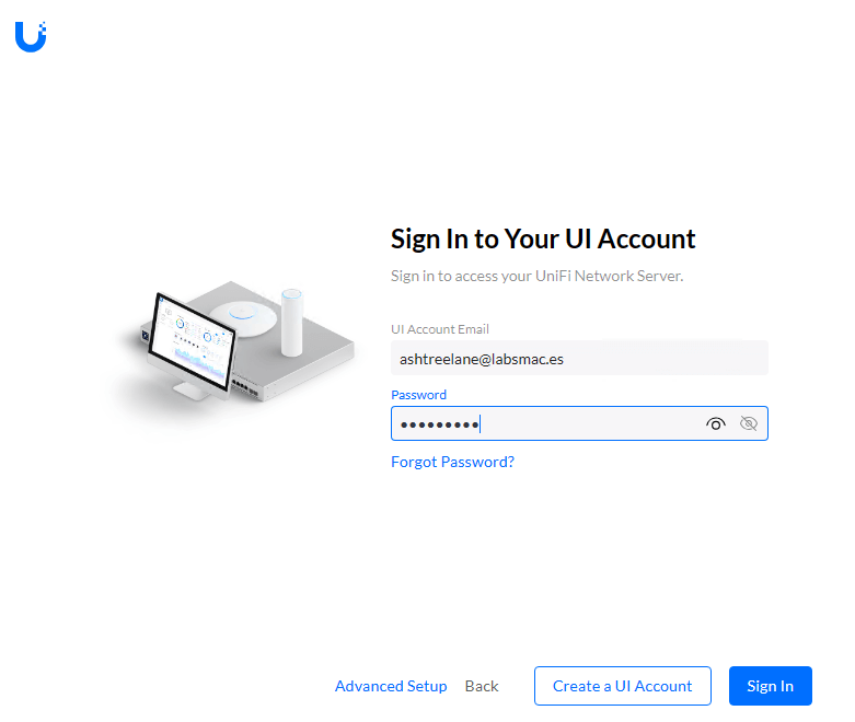 Si queremos usar una cuenta Ubiquiti, solo tenemos que iniciar sesión (Si no tenemos una, la creamos), si queremos usar una cuenta local, clicamos en Advanced Setup. En mi caso iniciaré sesión con una cuenta de Ubiquiti