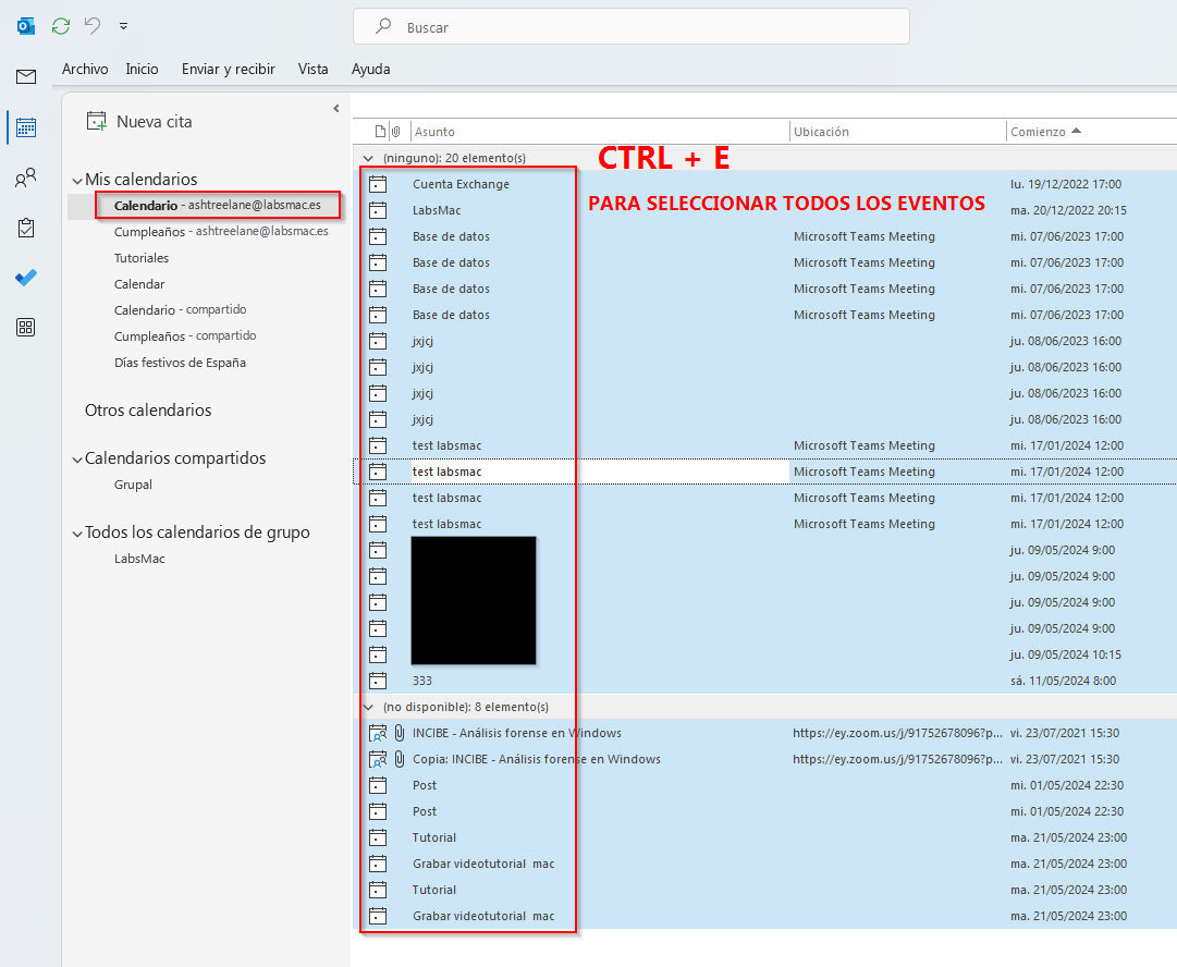 La otra vez metí la pata e importe muchas citas a mi calendario personal de Microsoft 365, y no encontré la manera de borrar todas las citas desde Outlook en la web o el Calendario de MAC, solo lo conseguí a través de Outlook de Windows.