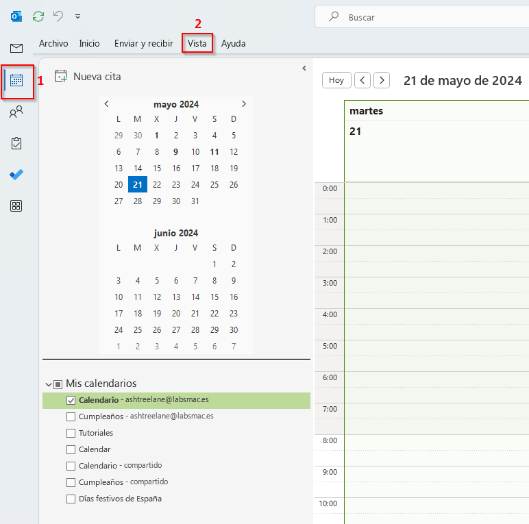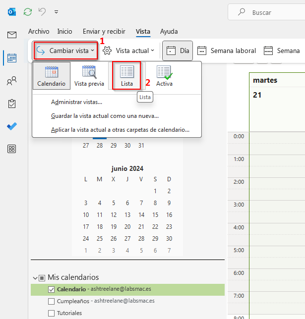 Para eliminar todas las entradas o eventos de nuestro calendario en Outlook de Windows, vamos a los calendarios y luego clicamos en Vista.