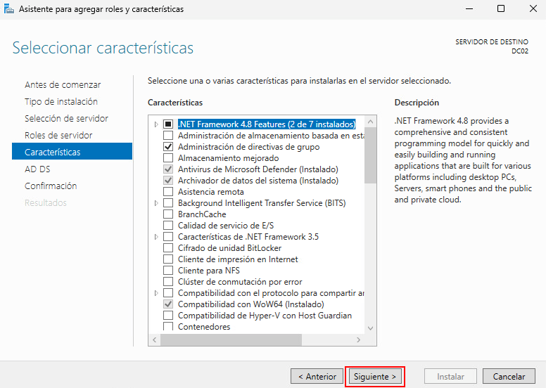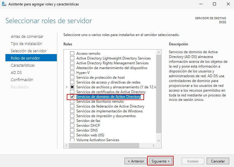 Seleccionamos el servidor donde instalaremos el rol. En este caso, DC02