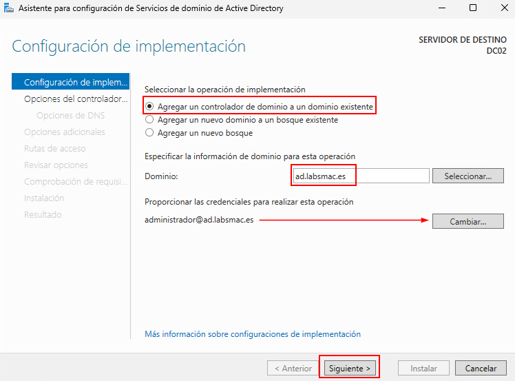 En este caso, se presentan varias opciones que conviene entender bien. Como ya disponemos de un bosque creado y no necesitamos añadir un nuevo dominio, sino incorporar un segundo controlador de dominio al ya existente (ad.labsmac.es).