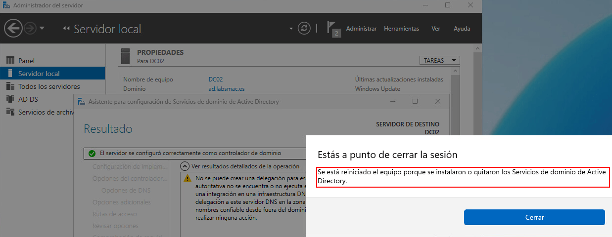 Si todo ha ido bien el servicio de AD, se instalará correctamente y ya