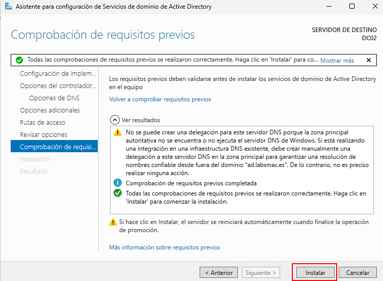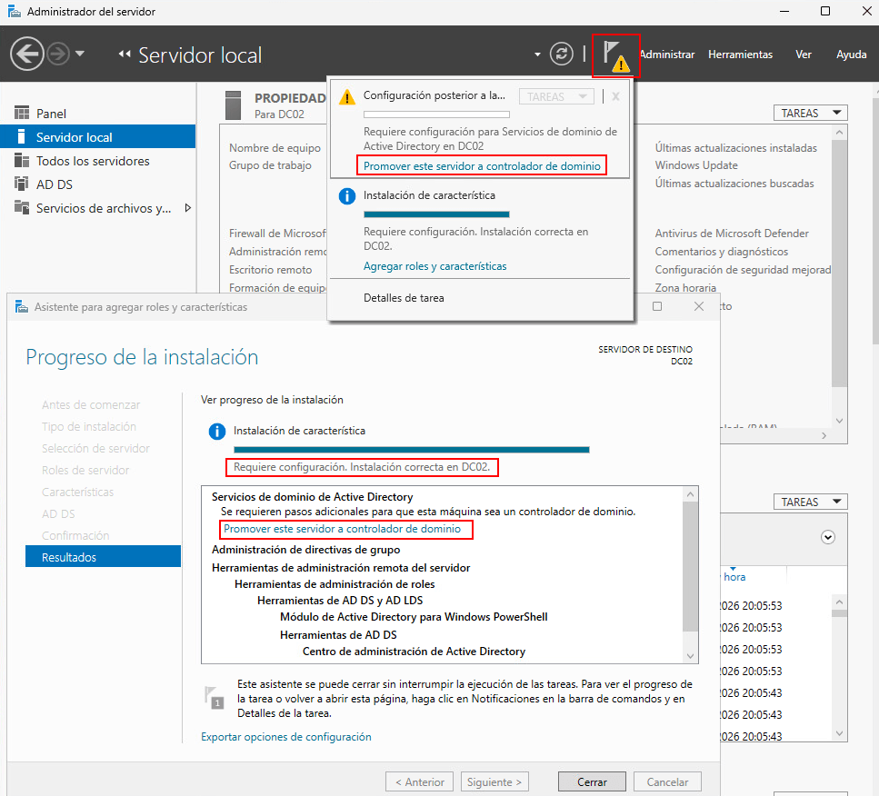 - Promoción a controlador de dominio (DC): se convertirá este segundo servidor en un controlador de dominio adicional.