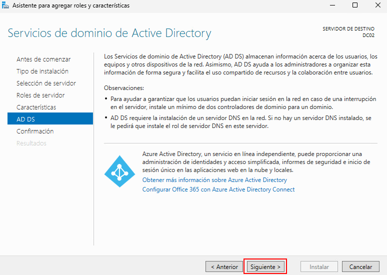 En esta pantalla seleccionamos las funciones que tendrá este controlador de dominio: