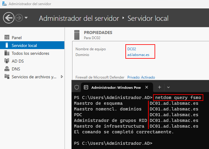 Como podemos observar nuestro segundo controlador, DC02, ya pertenece al dominio ad.labsmac.es. Si ejecutamos el siguiente comando, veremos que todos los roles FSMO siguen en DC01