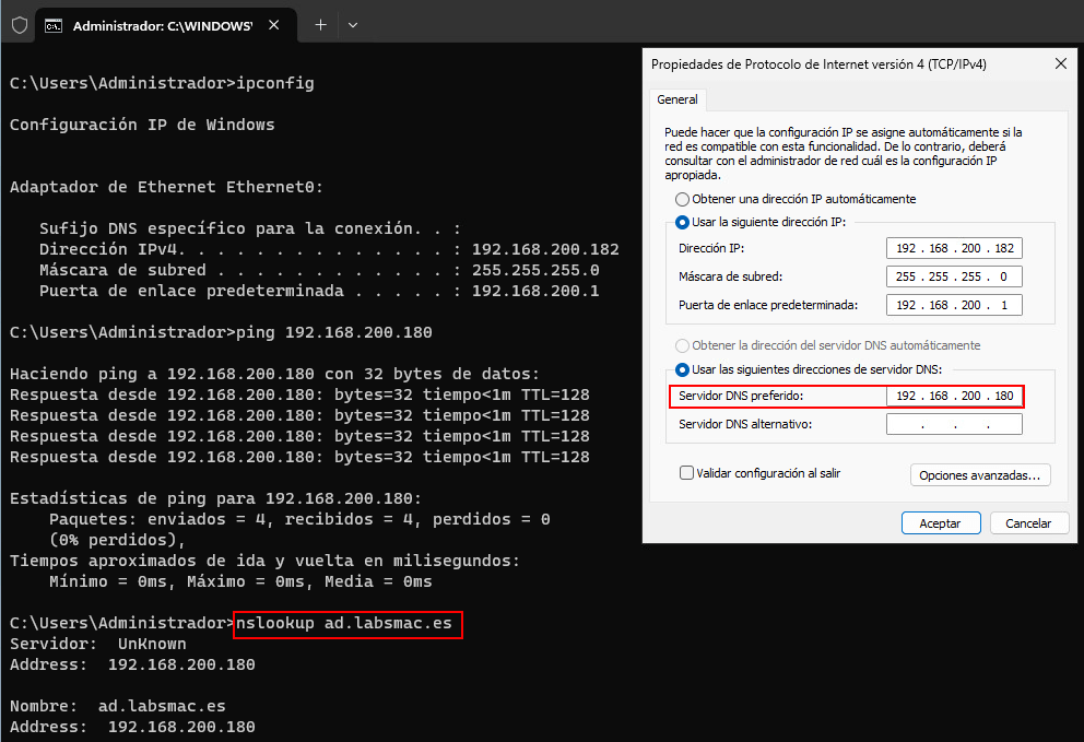 Es fundamental comprobar que este segundo servidor puede resolver correctamente el dominio ad.labsmac.es a través de DC01. Por ello, a continuación se muestra una captura de pantalla con las pruebas de conectividad y de resolución de nombres, verificando que la comunicación con el primer controlador de dominio es correcta.