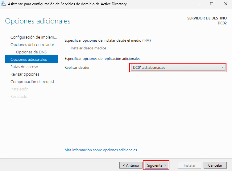 En esta pantalla seleccionamos el servidor desde donde se replicará, DC01.