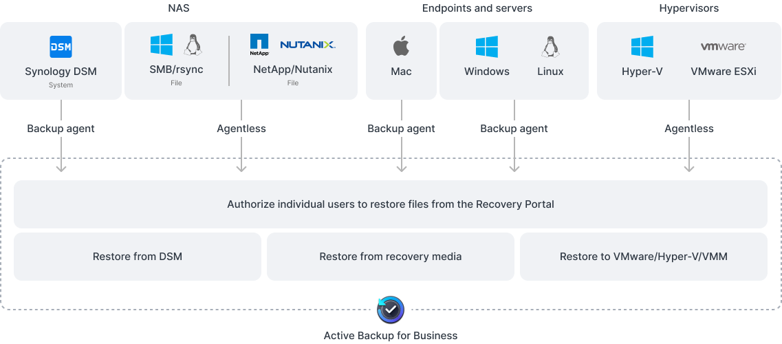 Active Backup for Business es una solución robusta diseñada por Synology para gestionar y proteger datos críticos de manera eficiente. Permite realizar copias de seguridad y restauraciones de diversos entornos, incluyendo: