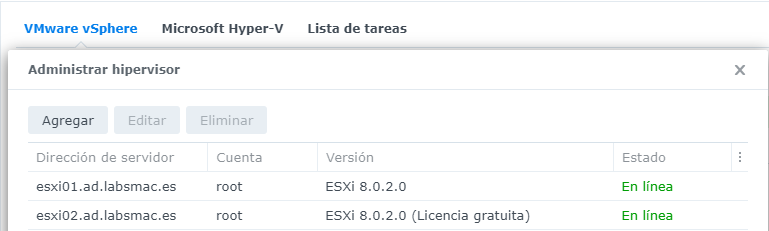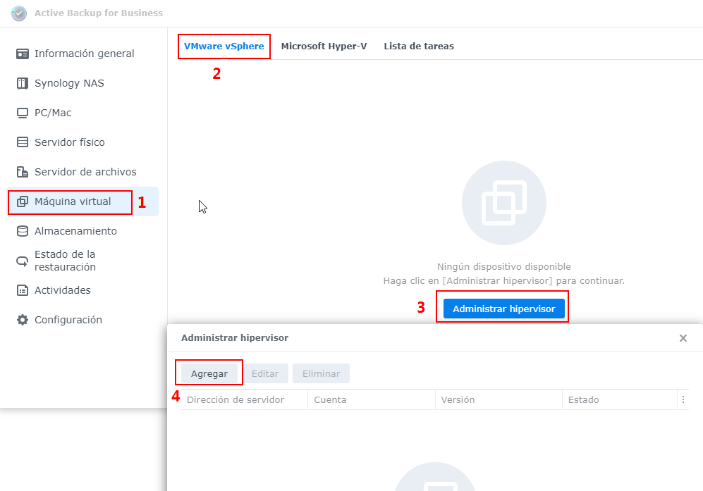 Antes de configurar una tarea de copia de seguridad, tenemos que conectar nuestro host ESXi con el software de Active Backup for Business. Para ello, abrimos la aplicación de AAB > Máquina virtual > Vmware Sphere > Administrar hipervisor > Agregar