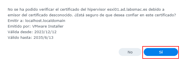En esta pantalla nos preguntará si queremos confiar en el certificado autofirmado del host ESXi, clicamos en Sí.