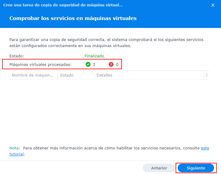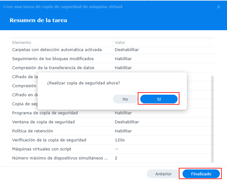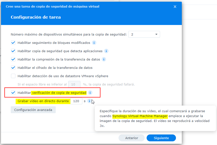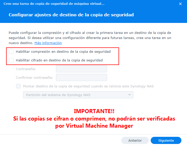 IMPORTANTE: Los NAS Synology ofrecen una forma de verificar la copia, arrancando una máquina virtual desde la copia de seguridad usando el paquete Virtual Machine Manager. Si elegimos cifrado o compresión, no podremos realizar esa verificación.