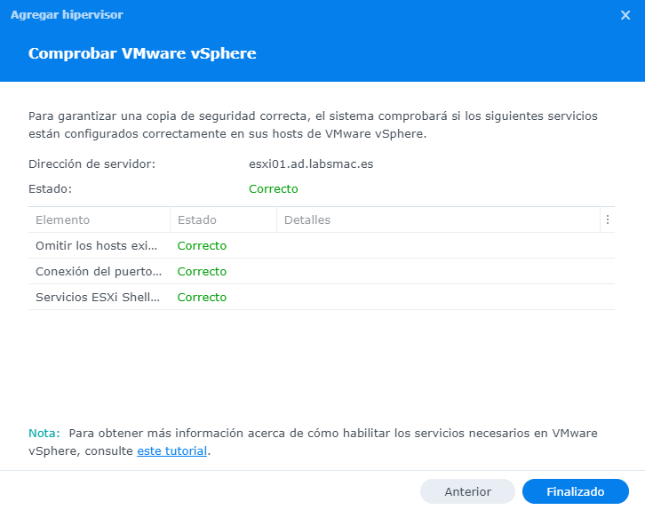 En esta pantalla es donde se harán comprobaciones contra el host ESXI. Si esta todo en verde, clicamos en finalizado. Recuerda que si nuestro host ESXi es gratuito, tendremos que activar los servicios de Secure Shell (SSH) y ESXi Shell para poder pasar a la siguiente pantalla.