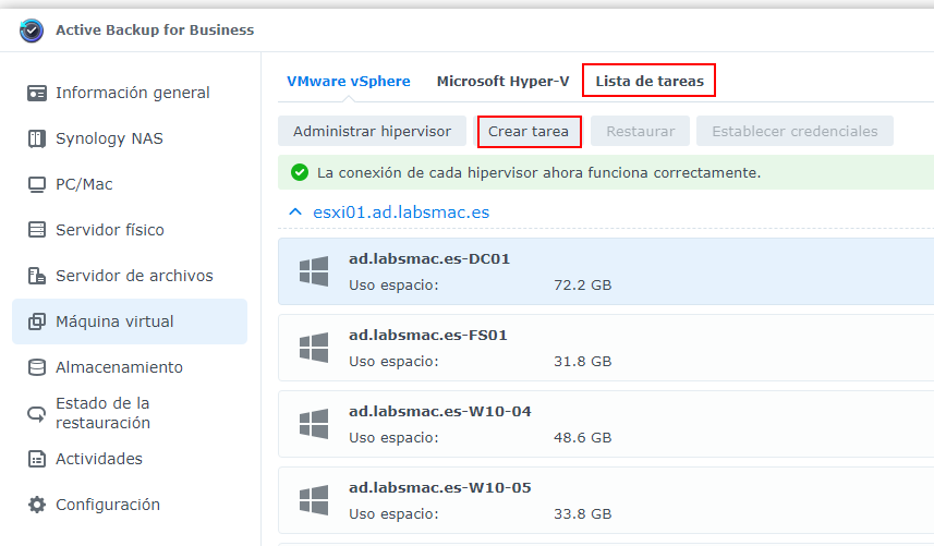 Una vez realizada la conexión entre el host ESXi y Active Backup for Business, nos toca crear las tareas de copia de seguridad para salvaguardar las máquinas virtuales.