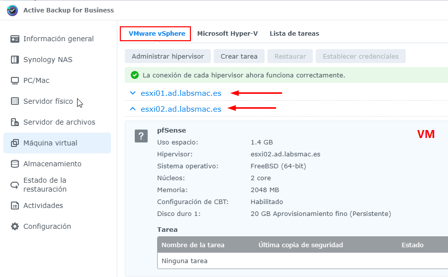 En Active Backup for Business > Máquina virtual > VMware vSphere nos aparecerá todos los ESXi disponibles y sus máquinas virtuales.