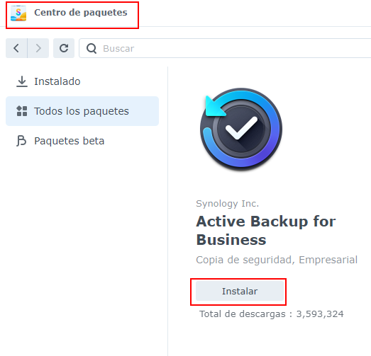 Si no hemos instalado la aplicación de Active Backup for Business, basta con buscar la aplicación en Centro de paquetes e instalarlo. Para usar el programa, tendremos que activar el software usando nuestra cuenta de Synolo