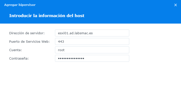 En esta pantalla agregamos los datos del host EXI como dirección IP o nombre DNS, puerto, cuenta administrador o un usuario con los siguientes permisos. Luego clicamos en siguiente.