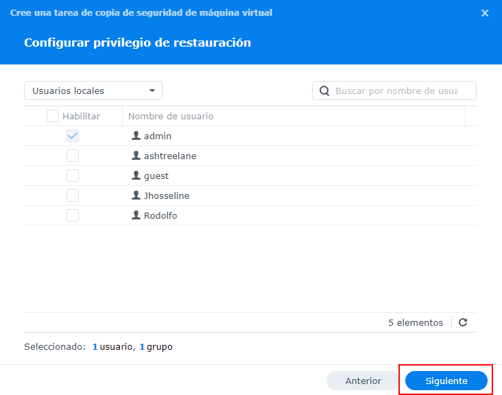 Aquí elegimos qué usuario/grupo tiene permisos para restauración de archivos de SO invitados (Windows/Linux). La restauración de archivos de SO invitados permite a los usuarios restaurar archivos individuales en lugar de toda la máquina virtual.