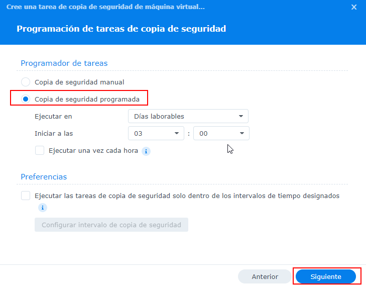 Aquí elegimos la programación de las copias, ¿manual o programada?, ¿dias laborales, fines de semana?