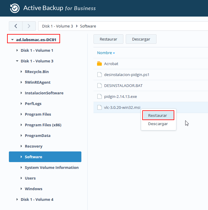 La restauración lo hacemos desde la aplicación de Active Backup for Business Portal