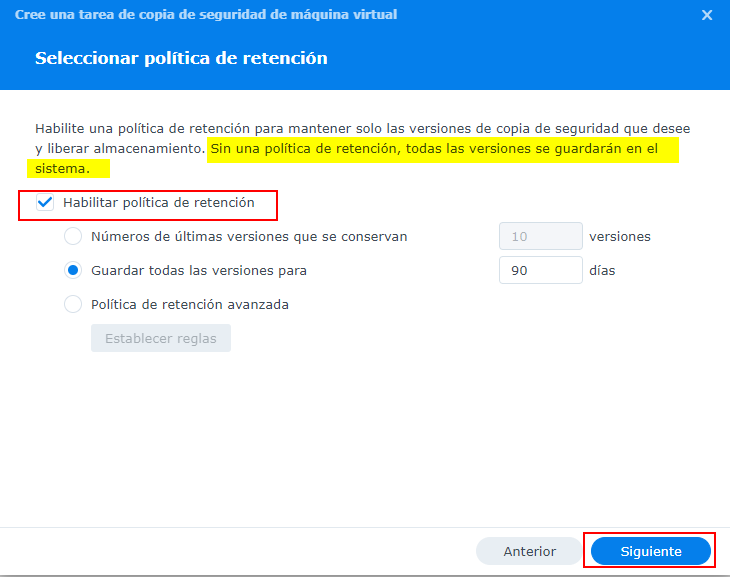 En esta pantalla elegimos la retención de las copias, si elegimos clicamos en Politica de retención avanzada, estaremos eligiendo el modelo: Grandfather-father-son (GFS). Si no elegimos ningúna politica, se guardarán todas las versiones en el NAS.