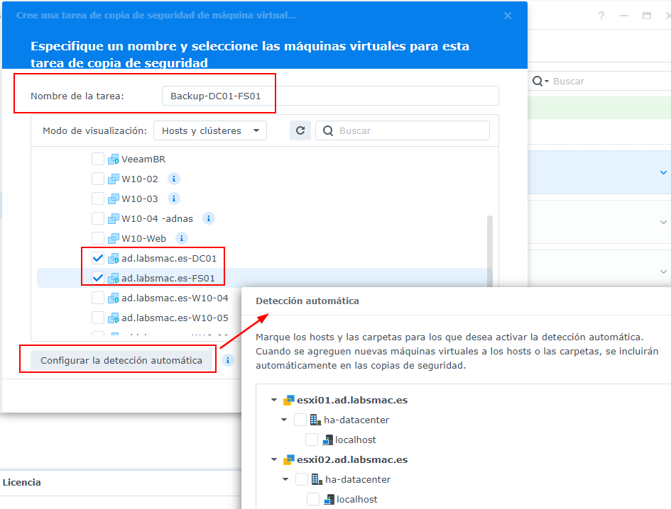 Además hay una opción interesante, detección automática, esta opción permite que se vayan agregando futuras máquinas de un host ESXi de forma automatica a la tarea de copia de seguridad. Basta con marcar la casilla del host ESXi donde queramos dicha característica.