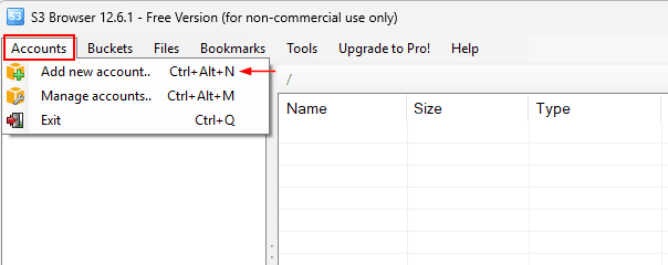Para conectarnos a nuestro bucket, hacemos clic en Accounts > Add new account…