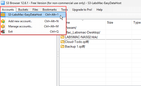 En Accounts podemos ver el listado de buckets listos para su conexión. Recordemos que la versión gratuita solo permite almacenar o guardar dos buckets S3, si queremos almacenar más, tendremos que optar por la versión de pago.