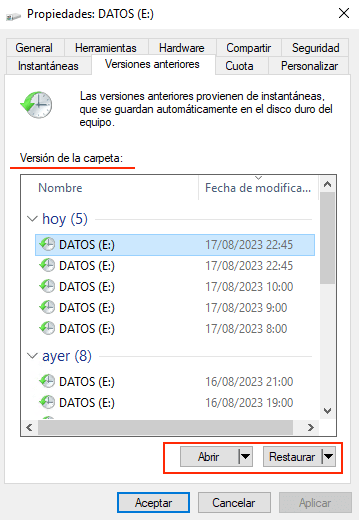 Solo debemos hacer clic derecho sobre archivo/carpeta/partición y clicar en Restaurar versiones anteriores. Aquí elegimos entre abrir el archivo/carpeta de la instantánea que queramos o restaurarlo