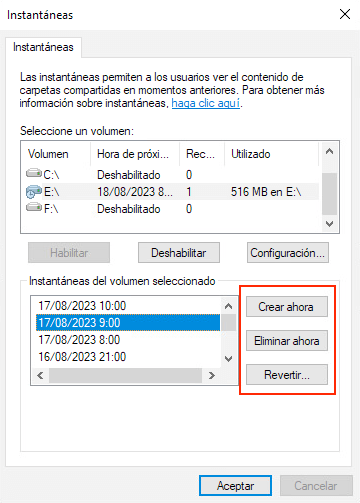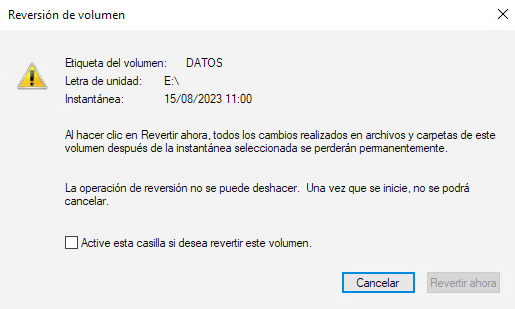 Hay una tercera opción llamada revertir, lo que hace es recuperar el volumen y todos sus datos que existian en esta «captura», y eliminar todas las demás instantáneas. Hay que tener mucho cuidado