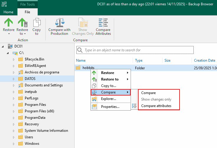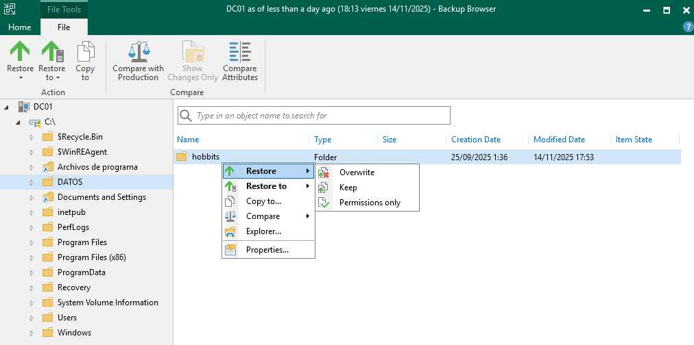 Tras eliminarla, utilizaremos la funcionalidad de restauración de Veeam Backup para recuperar la carpeta exactamente como estaba: se restaurará la carpeta junto con todos sus permisos NTFS originales.