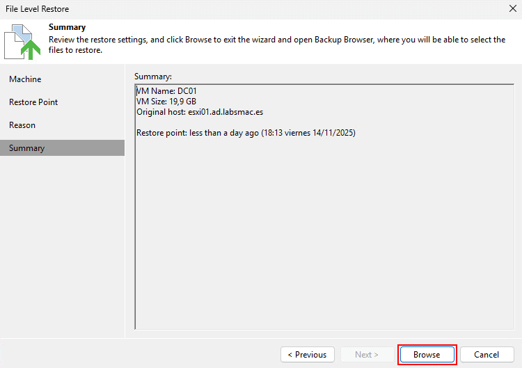 En esta pantalla nos aparecerá un resumen de la tarea de restauración, clicamos en Browse para continuar con la pantalla de restaurar archivos/carpetas/permisos.
